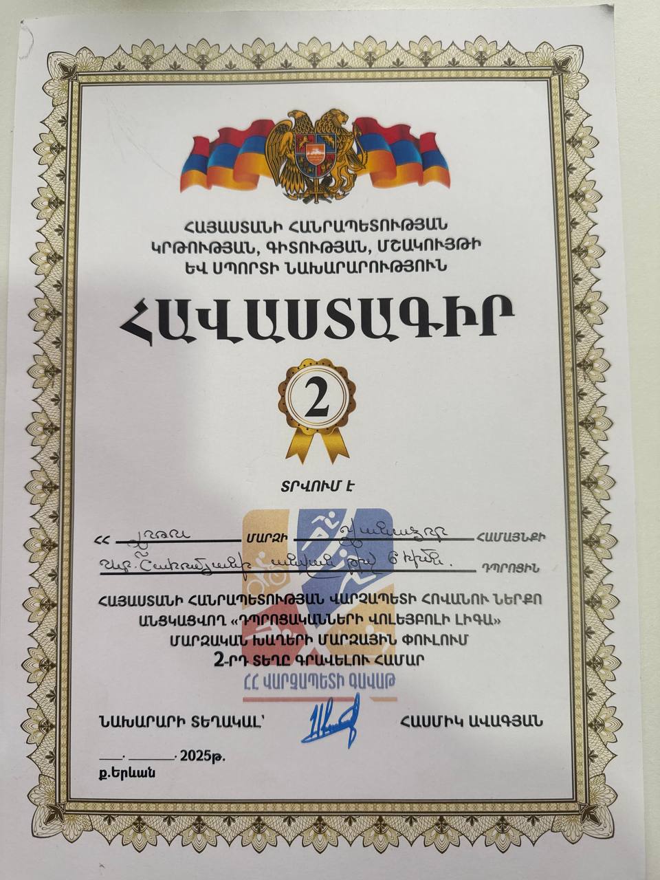 ՀՀ վարչապետի հովանու ներքո անցկացվող <<Դպրոցականների վոլեյբոլի լիգա>> մարզական խաղերի մարզային փուլում և Վանաձոր համայնքի վոլեյբոլի գավաթի խաղարկությունում երկրորդ պատվավոր տեղը զբաղեցնելու համար մեր դպրոցի թիմը պարգևատրվեց պատվոգրերով։